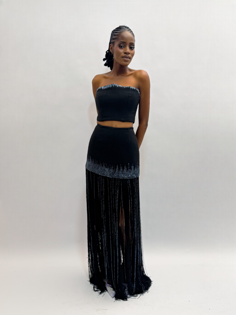 Strapless Black beaded Asoke Tasselled Skirt Set: Nya Lagos