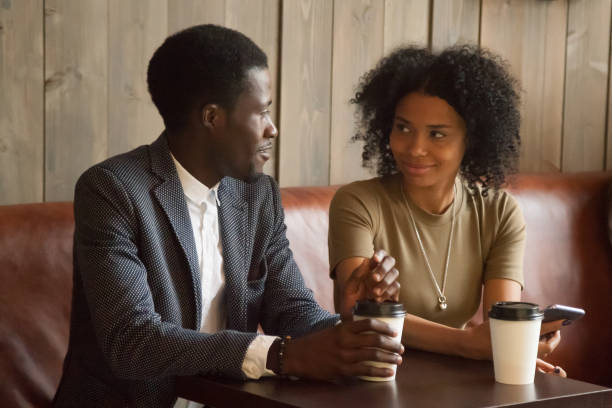 African man and woman talking flirting sitting at coffeehouse table, black young couple looking at each other with affection enjoying communication on date spending time together using phone in cafe