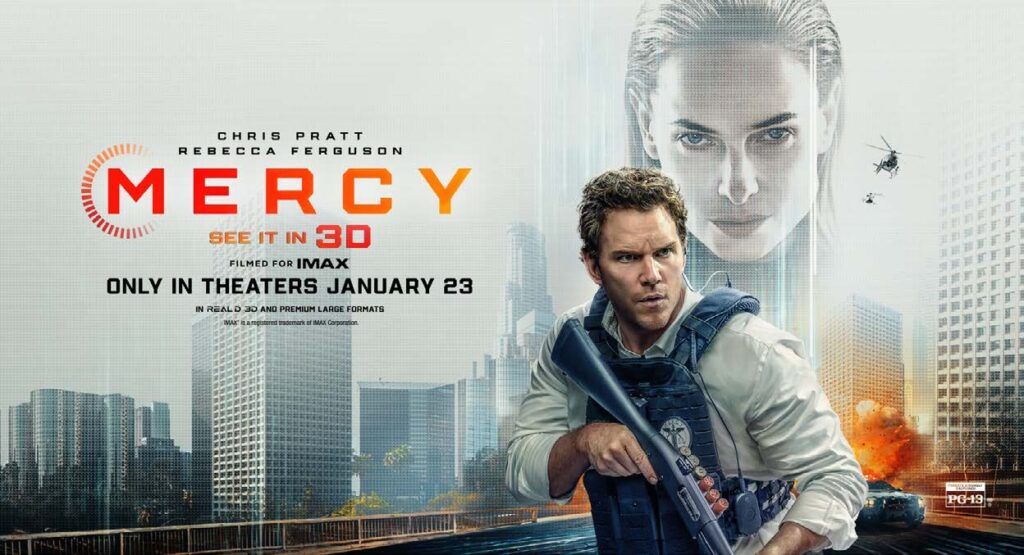 Filmmaker Timur Bekmambetov seems determined to make us look at screens when we go to the movies. Several of his films, including Unfriended, Searching and Profile (he produced the first two and directed the third), helped popularise the trend of so-called “screenlife” movies, in which the action is shown entirely via screens of one type or another (the horribly bad yet hilarious War of the Worlds movie from 2025 is the worst of these). He branches out a little with his latest effort, starring Chris Pratt as a man on trial for the alleged murder of his wife, with his fate to be decided by an artificial intelligence (AI) judge. Unfortunately, Mercy still contains so much footage shot from the perspective of doorbell cams, body cameras, drone cameras, iPhones, etc., that it should be avoided by anyone suffering from screen addiction—which these days is pretty much everybody.